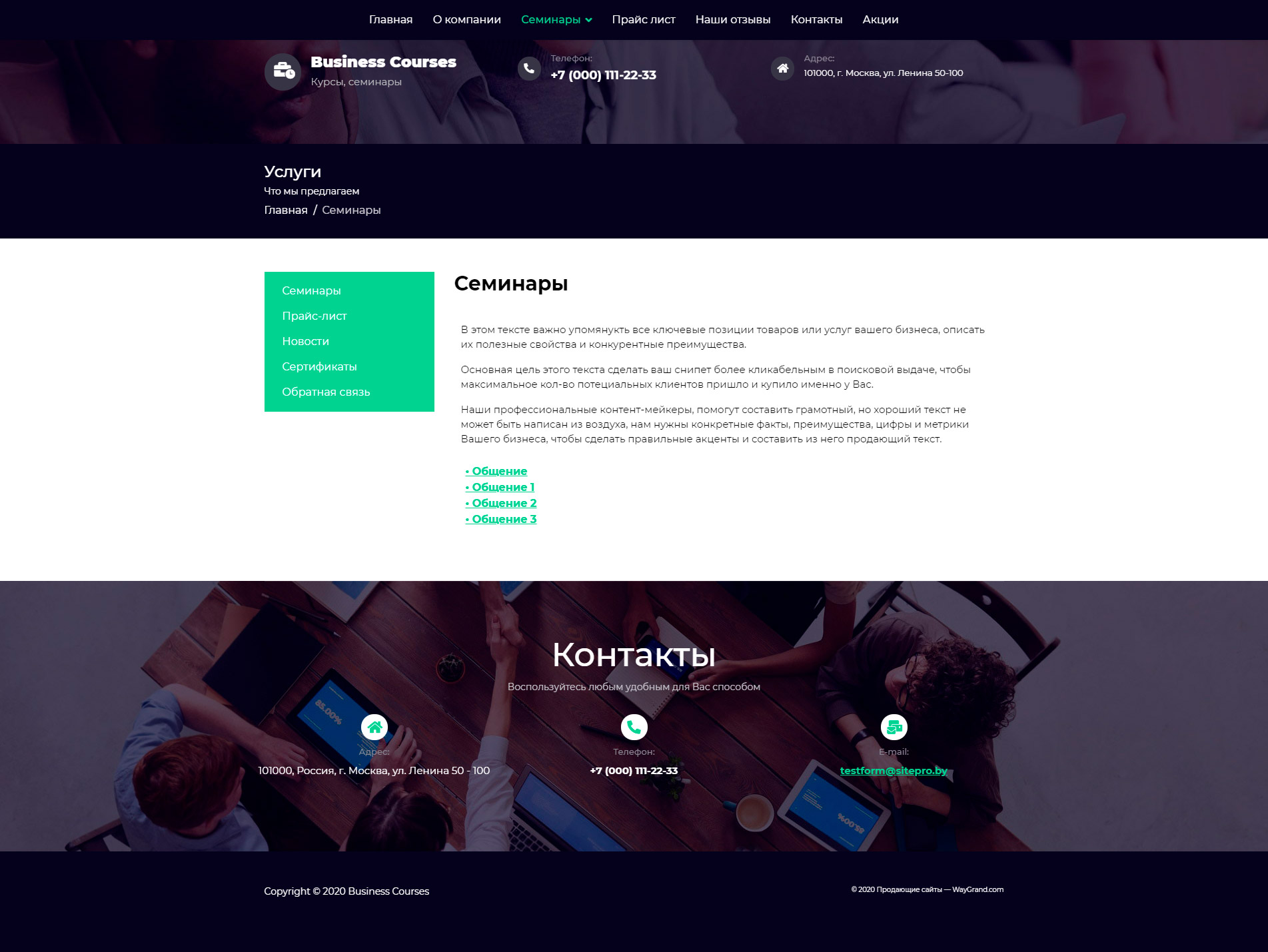 - Промогалерея "Бизнес курсы, семинары" с кнопкой призыва к действию "Обратная связь"