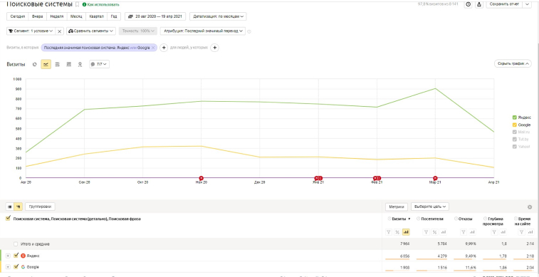 Работа велась в течение девяти месяцев, за это время мы проводили SEO-аудит, оптимизацию, анализировали действия конкурентов. Изначальные позиции сайта – далеко за сто в поиске выдачи. В ходе аудита были обнаружены многочисленные технические ошибки, которые также повлияли на столь низкое положение в поисковой системе